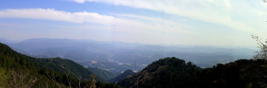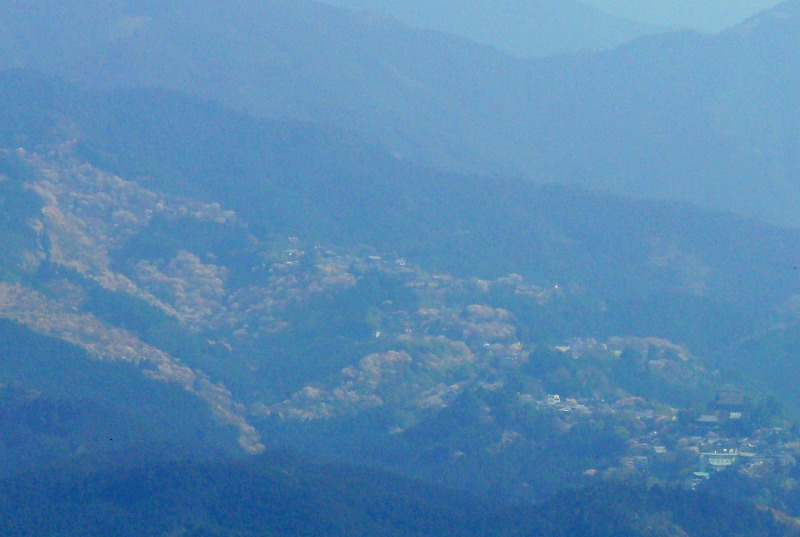 春霞ではっきりとは見えないものの、吉野全山が桜で埋め尽くされているのが見えました。写真ではいまいちですけど、肉眼では桜色に山が染まっているのが分かります♪ なんちゅう満開!こんな景色見たこと無いです。吉野の青い山々の中に、桜色の山肌が見えるのですよ♪ 疲れも忘れ、ぼーっと眺めていました。