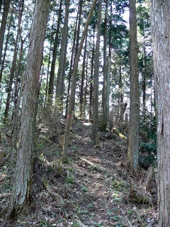ぅが、これがきつかった! 小さなピークを幾つか越えねばならなかったのと、立っては歩けないほどの急勾配!何ヶ所かの分岐。薄暗い木立の中の杣道。両槻会の某古会長なら、きっと道ではない!というに違いない場所も何箇所か。(笑)