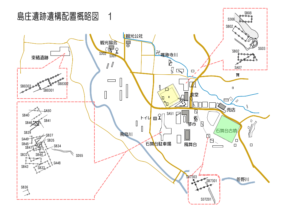 SA (塀・柵)・SB (建物)・SC (回廊)・SD (溝)・SE (井戸)・SF (道路)・SG (池)・SK (土坑)・SS (足場)・SY (窯)・SX (その他)