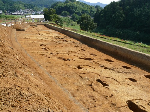今回の調査区からは、予想どおりの石が敷き詰められた広場があり、その下から南北に通る幅3.5mから4m、深さ約2mの溝の跡が見つかったようです。