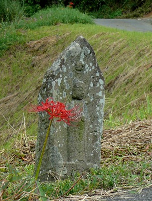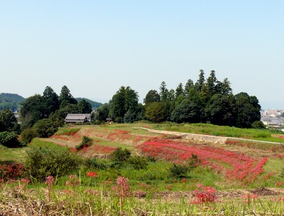 今、発掘現場に立てば、小さな尾根の上にあり、見晴らしのある住み良さそうな場所になっています。小さな谷の向こうには、檜隈寺跡於美阿志神社の森が見えます。先日は、彼岸花が見事に咲いていました♪