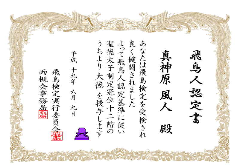 ただ、お名前(HN)と得点によるランク(十二冠位になぞらえた)をお知らせいただくと、飛鳥人認定書(結構立派な賞状風)を授与させていただきます。 下は、昨年のσ(^^)の飛鳥人認定書♪