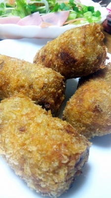 コロッケを作った♪ サワークリームいっぱい入れて♪ ジャガイモとカボチャバージョンを作った。美味しかったよ♪ まろやかな感じ。ソースとか何も掛けずに食べた方が美味しかった。
