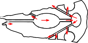 一度東の丸い所に溜まってからは、戻るように二つに分かれて流れ出すようです。