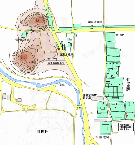 この遺跡からは、苑池や石敷きの遺構が検出されていて、小墾田宮の一部を構成するのではないかとされています。やはり、この辺に小墾田宮があったとすると、天武朝以前の山田道がこの切通を抜けている確率は低いと思うのです。飛鳥川の流れが現在の流路になった時に、山田道も付け替えられたのかも知れないですね。