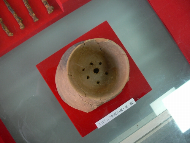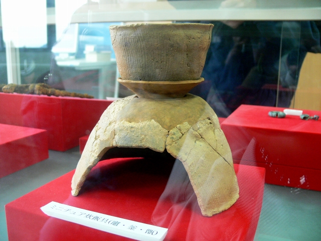 あっ! 105号に付け忘れたのですけど、咲読内にしばしば出てくる「ミニチュア炊飯具」っての写真です。これはパート2で案内することになる「スズミ1号墳」から出土した物です。撮影は、2006年11月に行われた明日香村発掘調査報告会で会場に展示された物です。