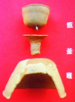 竈(かまど)、甑(こしき)、と読みます。 ↑ の写真の炊飯具の個別のパーツなんですけど、今と違って、お米は蒸して食べられてたんですね。いわゆる蒸し器セットとお思えばよいかなと。良い写真があります。
