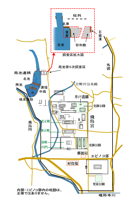 飛鳥京と苑池の図に、今回の苑池北池の発掘成果を描き込んだ。
