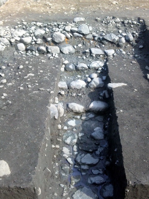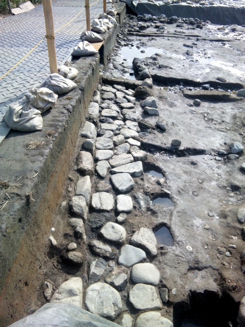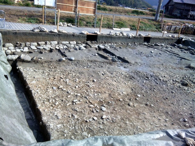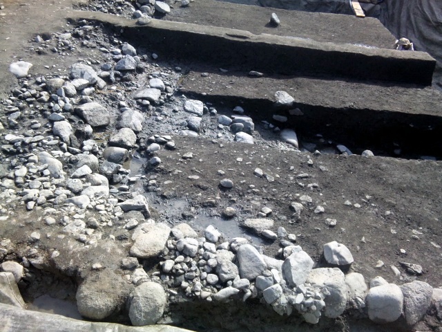 北池の東護岸を調べた結果、西に下る幅1・3メートル、長さ3メートル、高さ1・15メートルの5段の石段が出土。石段の幅は池の北東角から南へ約6・2メートルあったと推測できるという。1段分の高さは最上段だけ55センチと急で、以下は12~20センチ。