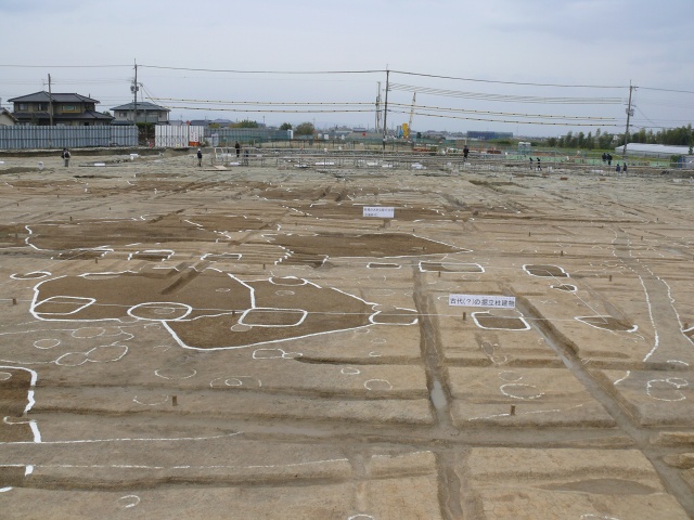 古代(?)の掘立柱建物とされていたのですけど、遺跡内のほぼ全部が地形に沿った方位に建てられているのですけど、この建物だけが正方位に従っています。飛鳥時代後半以降の役所的な建物なのかなぁ~と。そうすると周辺にもその時代の建物もあっても良いのになと。(^^ゞ