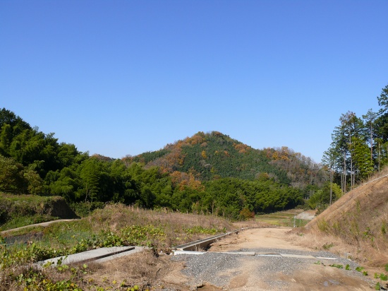 広い工事中?の道路が出来ていた。この道路の拡張のためにスズミが調査されたのかな?わりと簡単の真弓地の窪に出たので物足りなかった。(笑) この道路を通らないと、マルコ山までかなりの迂回路になってしまう。写真は、その道路(スズミ古墳辺り?)から貝吹山を振り返って撮ったもの。