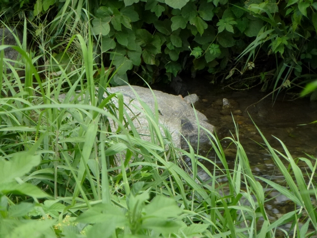 草が・・・、接近は不可能でした。解明は、冬ですな。(^^ゞ が、しかし、想定した地点に平らな石があることは間違いないですね。どの程度ちゃんと置かれた飛び石だったかはわかりません。自然に在った平らな石を利用して対岸に渡れたってだけかも知れません。覚えておいて、冬に行ってみます。