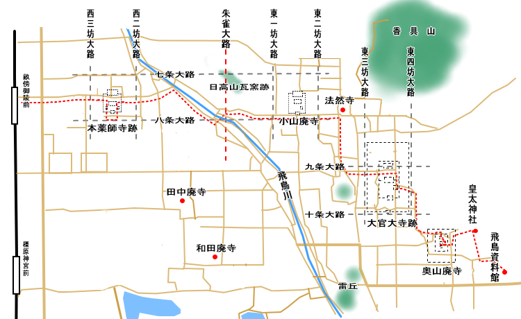 畝傍御陵前駅東口広場 → 本薬師寺跡 →