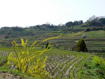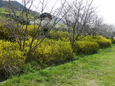そこから、稲渕へ。途中の坂田寺跡では、連翹が満開。
