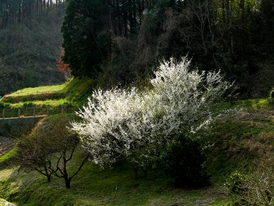 案山子ロードの上方には、紅梅かな?いや、桜の種類かな?