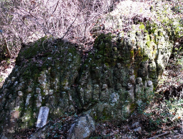 山道に入りすぐの五百羅漢。周辺には、数百体の石仏群がある。登山道は、その脇を登る。