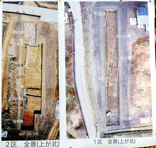 1区にあったと現説パンフに書いてあったけど、写真が無いし、トレンチ写真にマークも無い、「飛鳥寺南の石敷広場の東端を南北に走る石組溝の延長を1区北西で確認しました。」の謎を解く。(笑) (クリックして見てください)